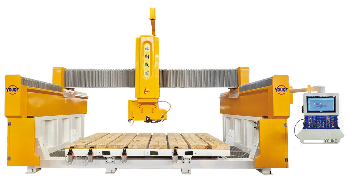 Эта машина представляет собой специально разработанный 5-осевой мостовой режущий станок, предназначенный для точной резки и профилирования стандартных плит и сложных, неправильных форм. Он способен обрабатывать широкий спектр геометрий, включая многоугольники, треугольники, веерообразные формы, столешницы, эллипсы, ромбы, круги, края с радиусом (bullnose), фаски под произвольным углом, а также прямые и кривые линии. Благодаря высокой скорости резки, исключительной точности и простоте эксплуатации, он идеально подходит для обработки таких материалов, как спеченный камень, мрамор, гранит, кварцевый камень и других заготовок неправильной или нестандартной формы.